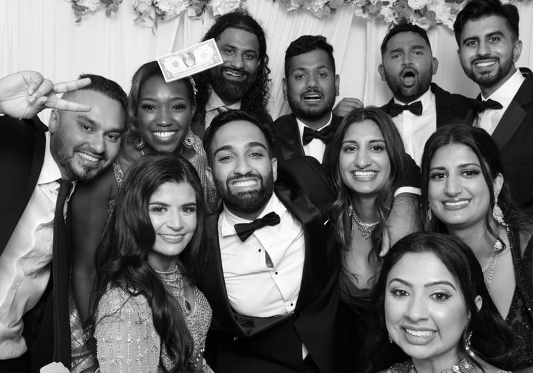 Our Glam Booth delivers smooth, flawless black-and-white or color portraits — the Hollywood-style booth everyone loves. Ideal for weddings, engagement parties, and elegant events where guests want premium photos.